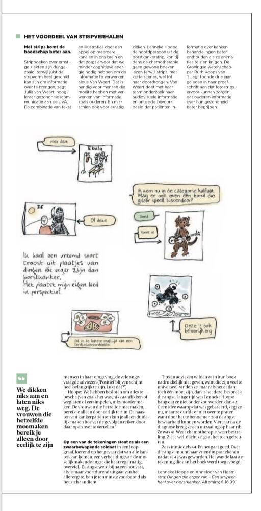 Ook ben ik in 2018 begonnen met het maken van een graphic novel in samenwerking met Lenneke Hoope. Ik teken en schrijf over haar leven met borstkanker in 2014 en 2015. Op dit moment (2020) zijn we in gesprek met verschillende uitgevers.